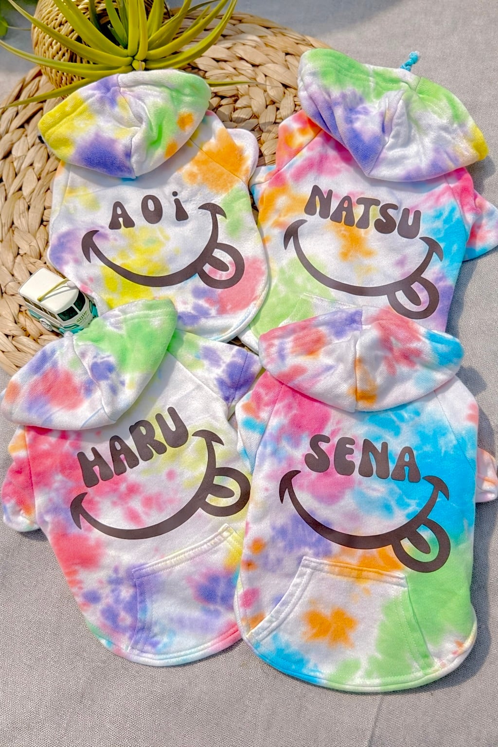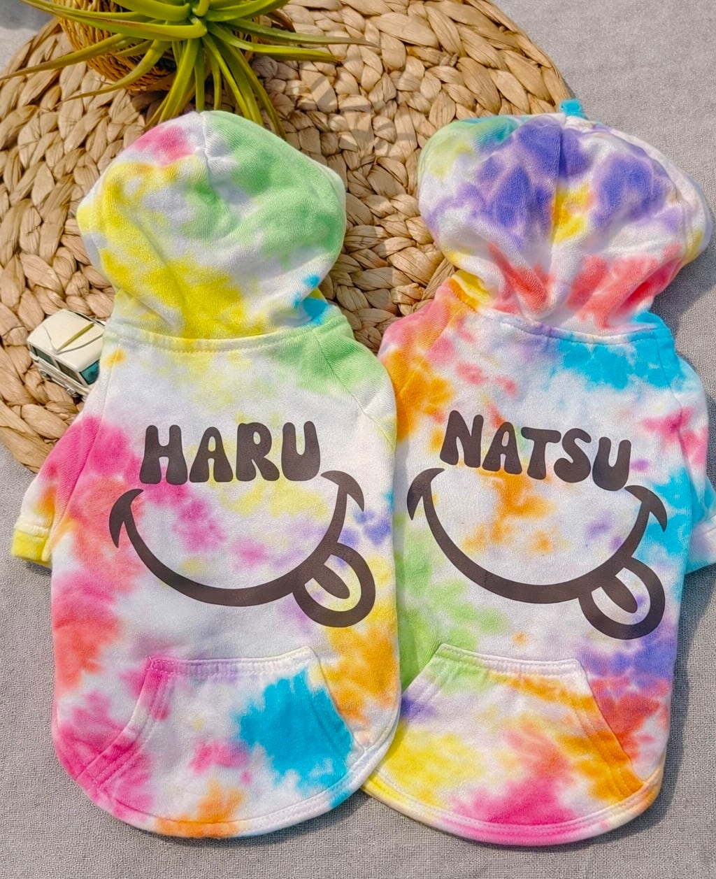 ピンク・オレンジ・イエロー・グリーン・ターコイズ・パープル・レッドの7色を使用して染めますが、色の出方はそれぞれで色の配置やバランスなどは指定できません。