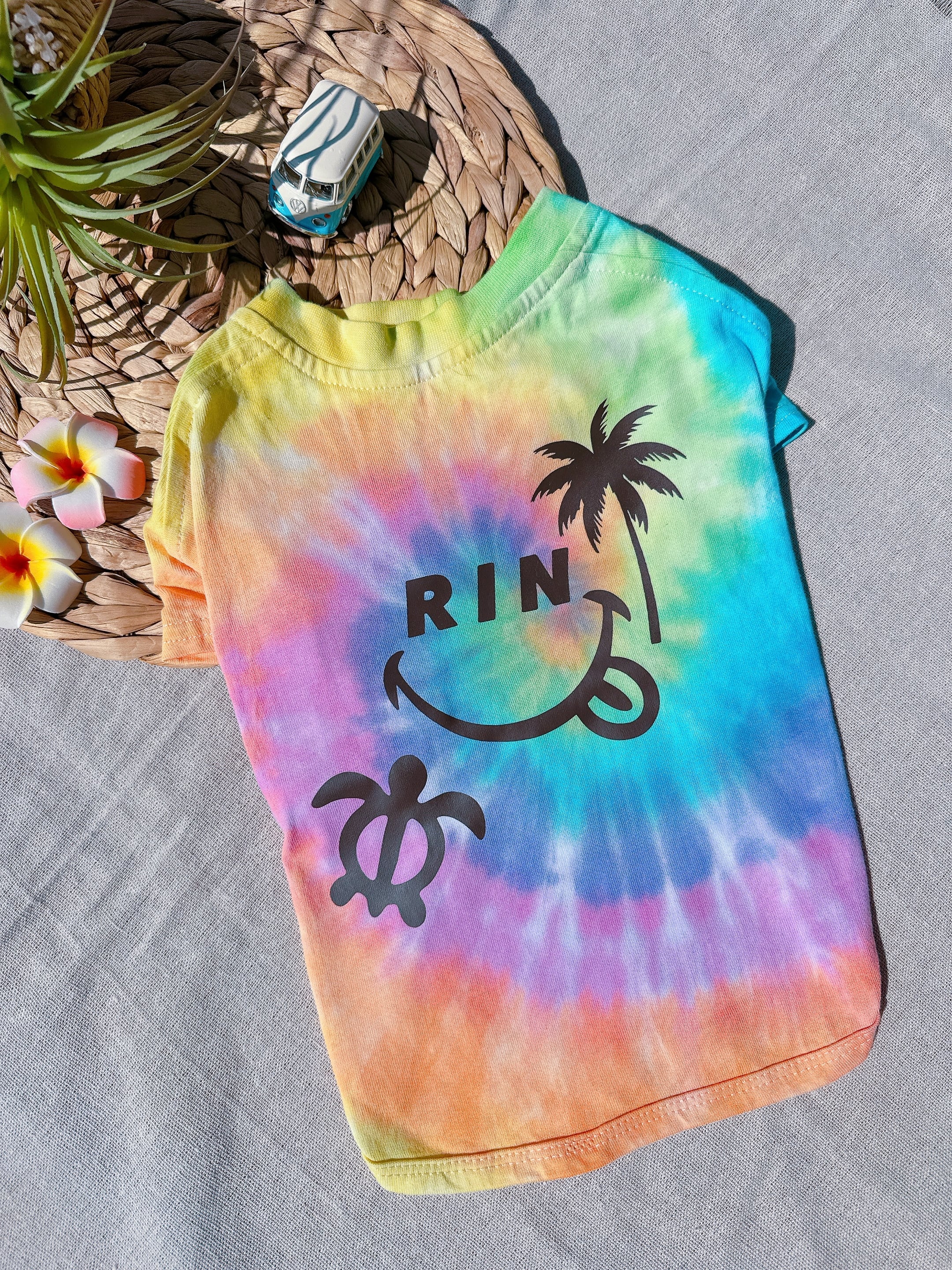 ピンク・オレンジ・イエロー・グリーン・ターコイズ・パープルの6色を使用して染めますが、色の出方はそれぞれで色の配置やバランスなどは指定できません。